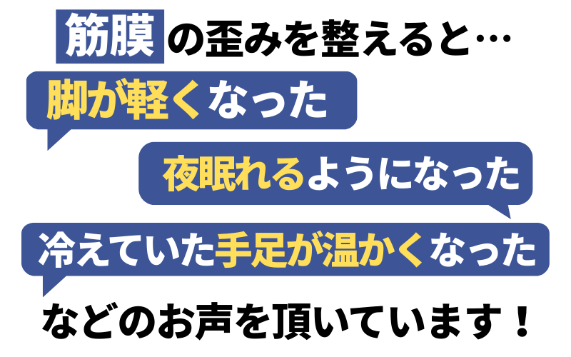 こうした筋膜のねじれや癒着により「血流」や「リンパ」の巡りが悪くなり、発熱や腫れ、むくみ、頭痛、肩こり、腰痛、冷え、生理痛、ボディラインの崩れを引き起こすとされています。